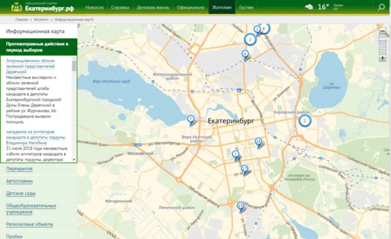 Новый раздел «Карта противоправных действий» появился на официальном сайте Екатеринбурга. Здесь посетители сайта смогут узнать в том числе о нападениях на кандидатов в гордуму.