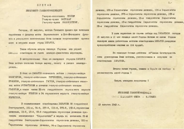 Один из самых значительных документов — директива Ставки верховного главнокомандования об утверждении плана освобождения Харькова. Эта операция стала «одной из финальных точек стратегического наступления войск Красной армии на Курской дуге». Даже несмотря на гриф особой важности, в документе не называются настоящие фамилии военачальников, ответственных за подготовку и исход операции: Георгий Жуков и Александр Василевский скрыты под псевдонимами Юрьев и Васильев, отмечает телеканал 360 .
