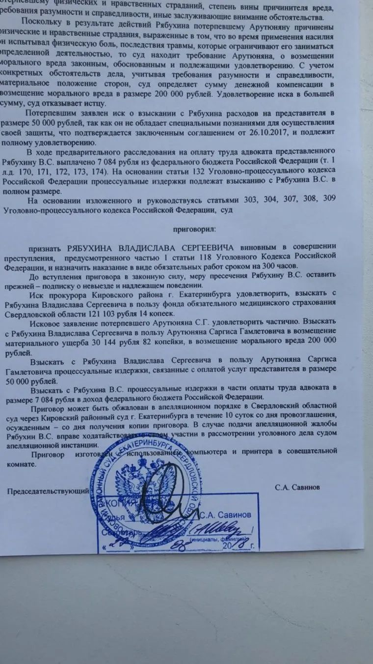 Такое решение принял судья Сергей Савинов. Действия Рябухина он расценил не как умышленное причинение тяжкого вреда здоровью, а как причинение тяжкого вреда по неосторожности и переквалифицировал дело со 111-й статьи Уголовного кодекса РФ на 118-ю. «Назначить наказание в виде 300 часов исправительных работ», — озвучил свой вердикт судья Савинов. Также Рябухину надлежит выплатить Сарго Арутюняну, признанному потерпевшим, около 360 тысяч рублей по искам о возмещении вреда.