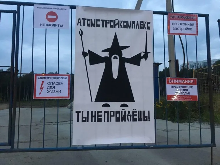 Жители Академического устроили акцию протеста против вырубки березовой рощи компанией «Атомстройкомплекс». На въезде к вырубленному участку активисты развесили плакаты с обращением к строителям. На одном из них, например, изображена фигура Гендальфа из «Властелина Колец» с надписью «Атомстройкомплекс, ты не пройдешь!».