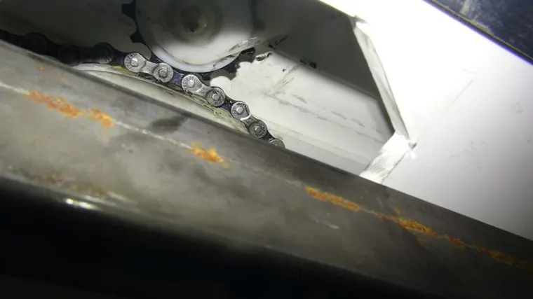 В это отверстие засунула руку девочка, и палец застрял между шестеренкой и цепью