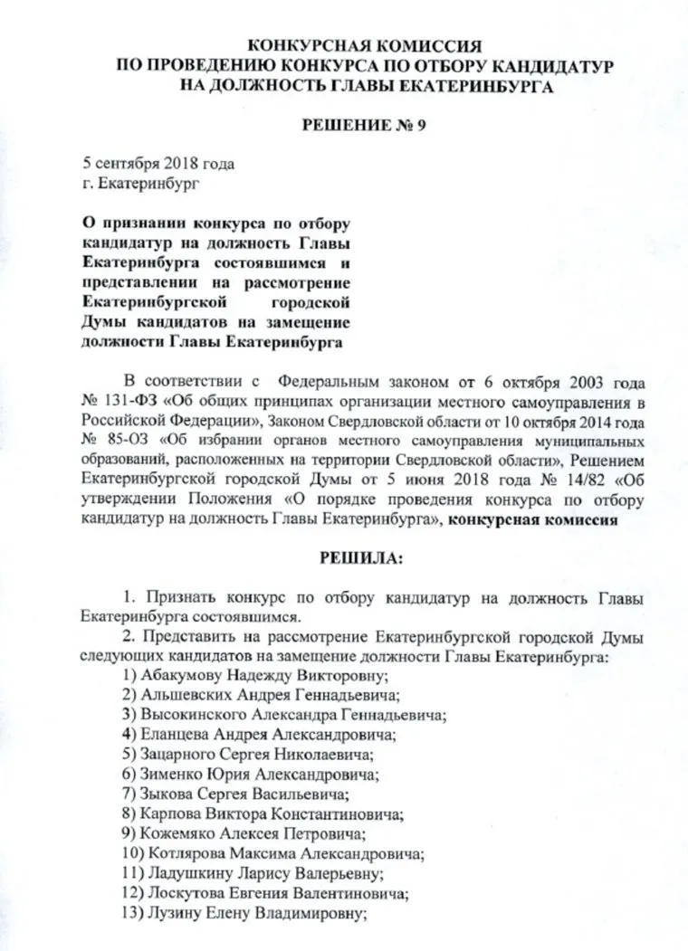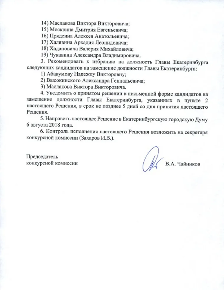Комиссия по отбору кандидатов для участия в выборах мэра Екатеринбурга приняла решение по финалистам гонки. Участники совещания определили, что представить в думу нужно всех 19 кандидатов. Но порекомендовали трех: это вице-спикер Заксобрания Виктор Маслаков, вице-губернатор Александр Высокинский и юрист Надежда Абакумова.
