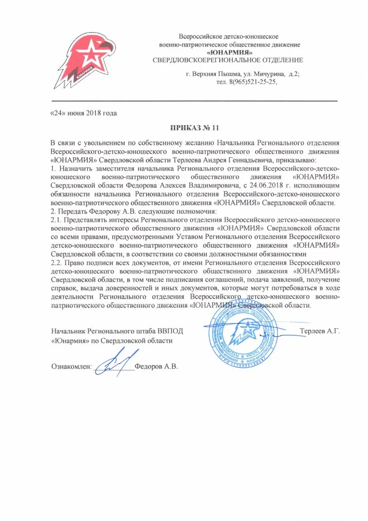«Начальник регионального штаба Андрей Терлеев подал заявление об отставке в июне и своим приказом назначил меня исполняющим обязанности начштаба. Согласно Устава организации, принять отставку и утвердить нового руководителя может только слет, на котором должны проголосовать не менее половины членов движения, всего в области четыре тысячи юнармейцев. Слет был назначен на 30 октября», — рассказал «URA.RU» Алексей Федоров .