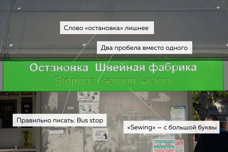 Первым обнаружил несуразности лидер движения «Челябинский урбанист» Лев Владов. Фотографии табличек с ошибками он опубликовал в группе движения в соцсети «ВКонтакте». Так, остановка «Швейная фабрика» в английском варианте у переводчиков звучит как «Stopbus sewing factory» (правильно — «Sewing factory bus stop»), а «Центре» — как «Sity Centre» (правильно — «City Centre»). В последнем случае ошибка считается грубейшей даже для школьников. Однако безграмотность обнаружилась не только при написании английских названий. Так, в русском названии остановки «Северо-восток» пропущен дефис.