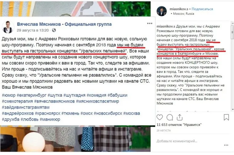 Сейчас середина сентября, но при попытке найти афишу «Ваших пельменей» или хотя бы сайт нового шоу интернет-поисковики не выдают никаких результатов. Изменения произошли и в посте на странице Мясникова в Instagram (деятельность запрещена в РФ), где он рассказал о работе над новым проектом. В сообщении была добавлена информация, что артисты перестанут гастролировать по всем городам, кроме Москвы и Екатеринбурга. В разных пабликах сохранилась старая версия записи шоумена, поэтому удалось их сравнить.