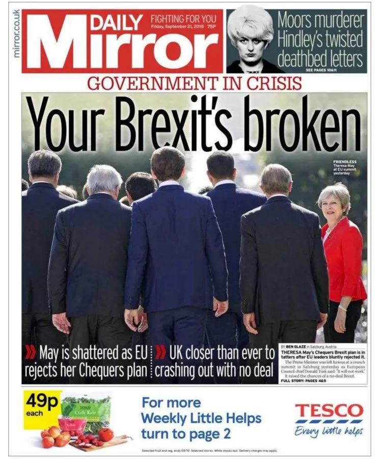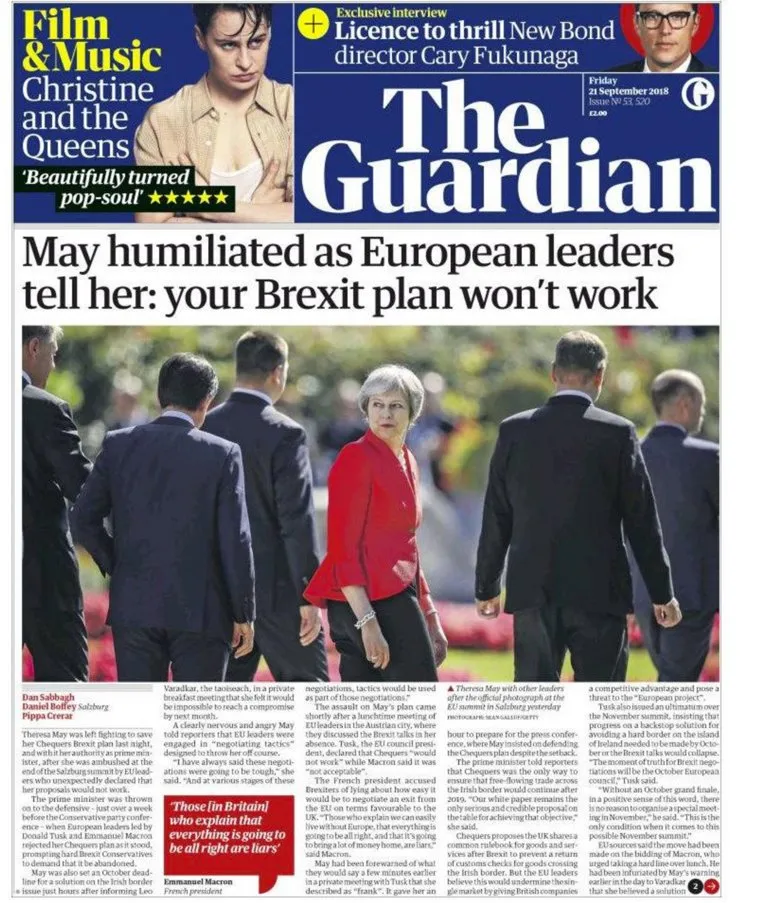 На обложке другого издания — Daily Mirror — разместили говорящее фото Терезы Мэй, которая выделяется на фоне других лидеров ЕС и одиноко стоит в стороне, смотря в другую сторону. «Ваш Брексит сломался», — говорится в заголовке. Газеты Guardian и Times, в свою очередь, назвали двухдневный саммит в Австрии «унижением» для Мэй. Там внимание акцентируется на словах Макрона, который заявил следующее: «Тот, кто утверждает, что после Брексита все будет в порядке, лжет». На главном фото Мэй также изображена «покинутой» в окружении коллег.