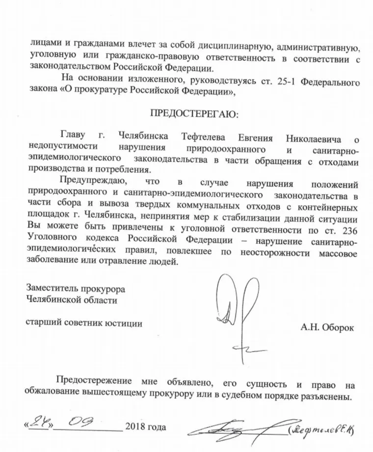Предостережение о недопустимости нарушения закона подписал зампрокурора области Андрей Оборок. Документ датирован 24 сентября. В тот же день он был вручен Евгению Тефтелеву, о чем свидетельствует его подпись в документе.