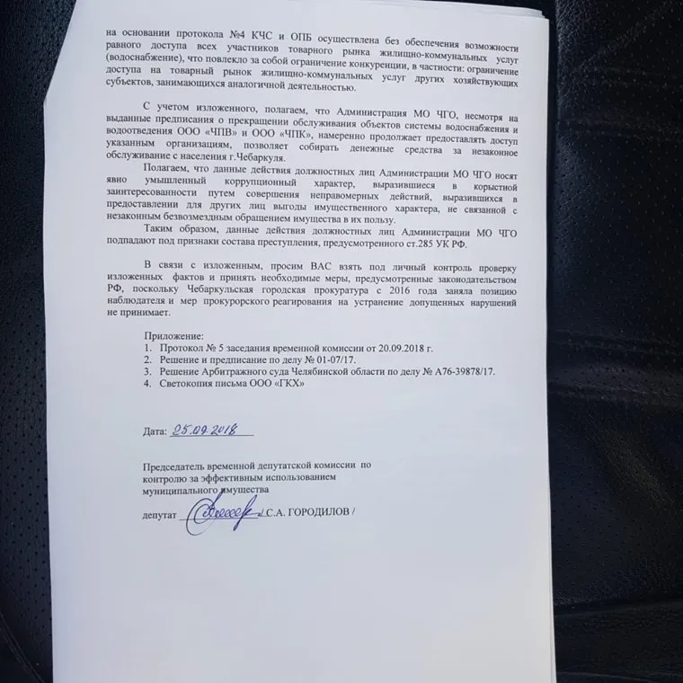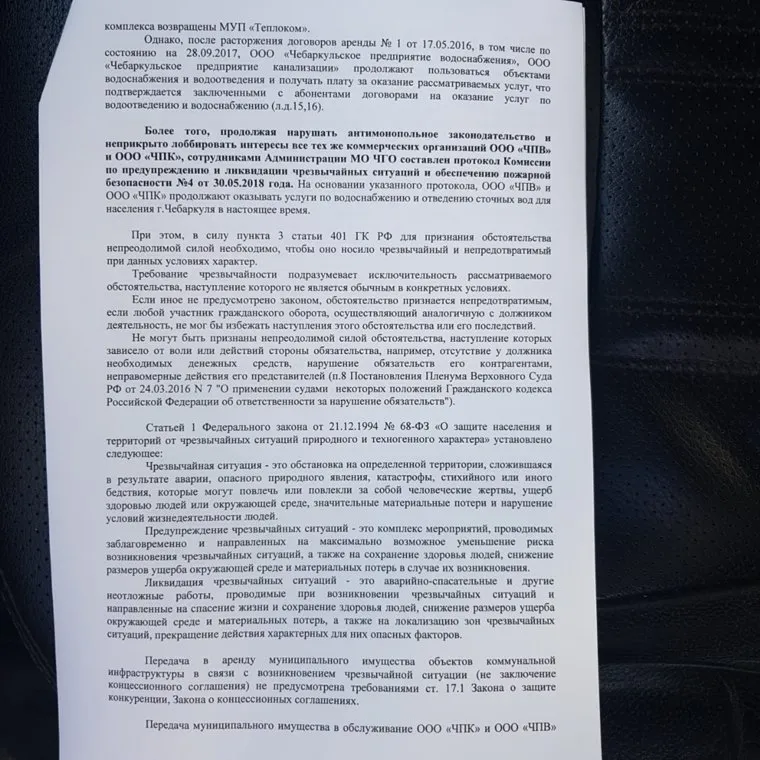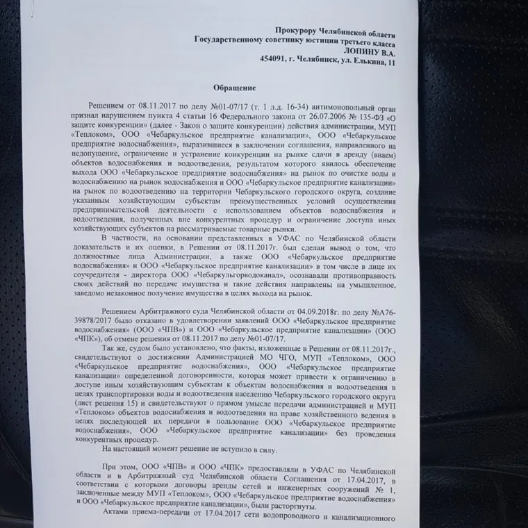 Обращение к недавно назначенному главе надзорного ведомства было принято по результатам работы специально созданной комиссии по контролю за эффективным использованием муниципального имущества. Как рассказал «URA.RU» ее председатель Сергей Городилов , больше двух лет сети по решению мэрии без конкурса переданы в ООО «Чебаркульское предприятие водоснабжения» (ЧПВ) и ООО «Чебаркульское предприятие канализации» (ЧПК). Управление федеральной антимонопольной службы признало действия чиновников незаконными . Однако мэрия объявила ЧС и под видом борьбы со стихией вновь передала сети в те же частные фирмы.