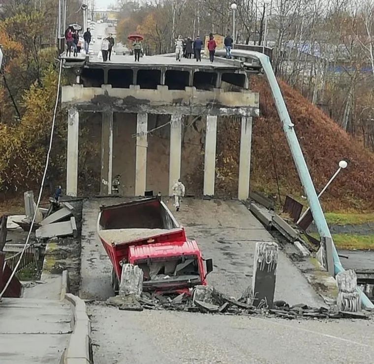 По данным спасателей, ЧП произошло утром 9 октября в городе Свободном. На переправу заехал большегруз, и мост за несколько секунд сложился. Обрушились два пролета виадука. Под падающей конструкцией по путям Забайкальской железной дороги двигался грузовой состав, он успел проскочить до обрушения бетонного моста.