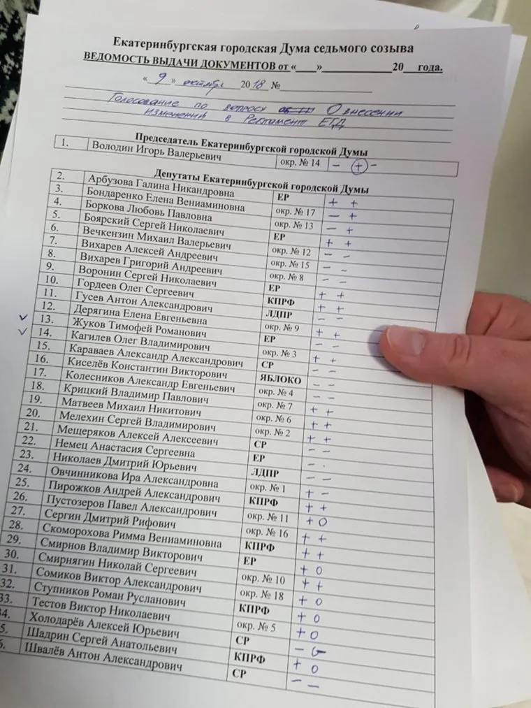 Первая колонка с плюсами и минусами в таблице — поименное голосование по поводу изменений в регламент, предложенных «Единой Россией»
