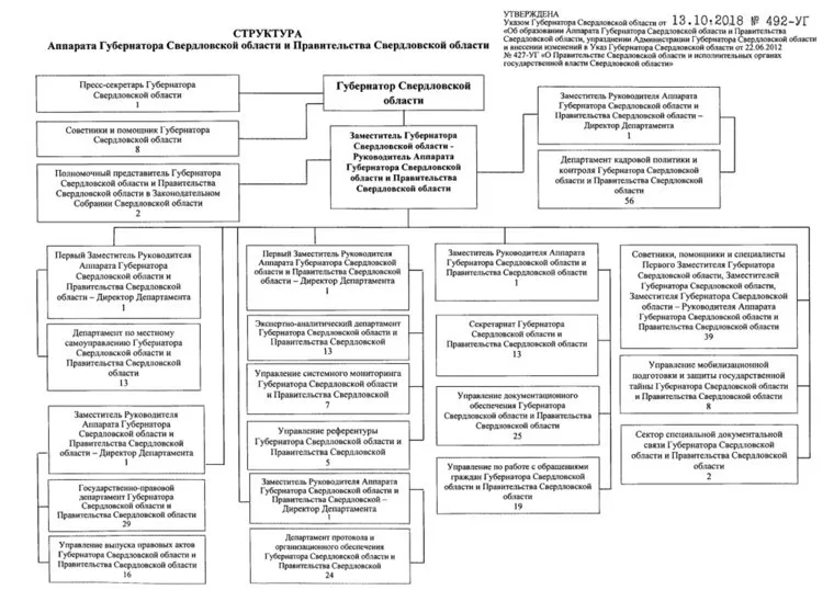 Губернатор Свердловской области Евгений Куйвашев официально утвердил новую структуру аппарата губернатора и правительства Свердловской области, которая должна заменить существовавшую 23 года администрацию губернатора. Соответствующий указ опубликован в субботу, 13 октября, на официальном интернет-портале правовой информации Свердловской области. Тем же указом ликвидируется администрация губернатора.