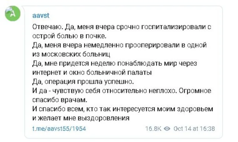 «Да, меня вчера срочно госпитализировали с острой болью в почке. Да, меня вчера немедленно прооперировали в одной из московских больниц. Да, мне придется неделю понаблюдать мир через интернет и окно больничной палаты», — написал Венедиктов в telegram-канале 14 октября.