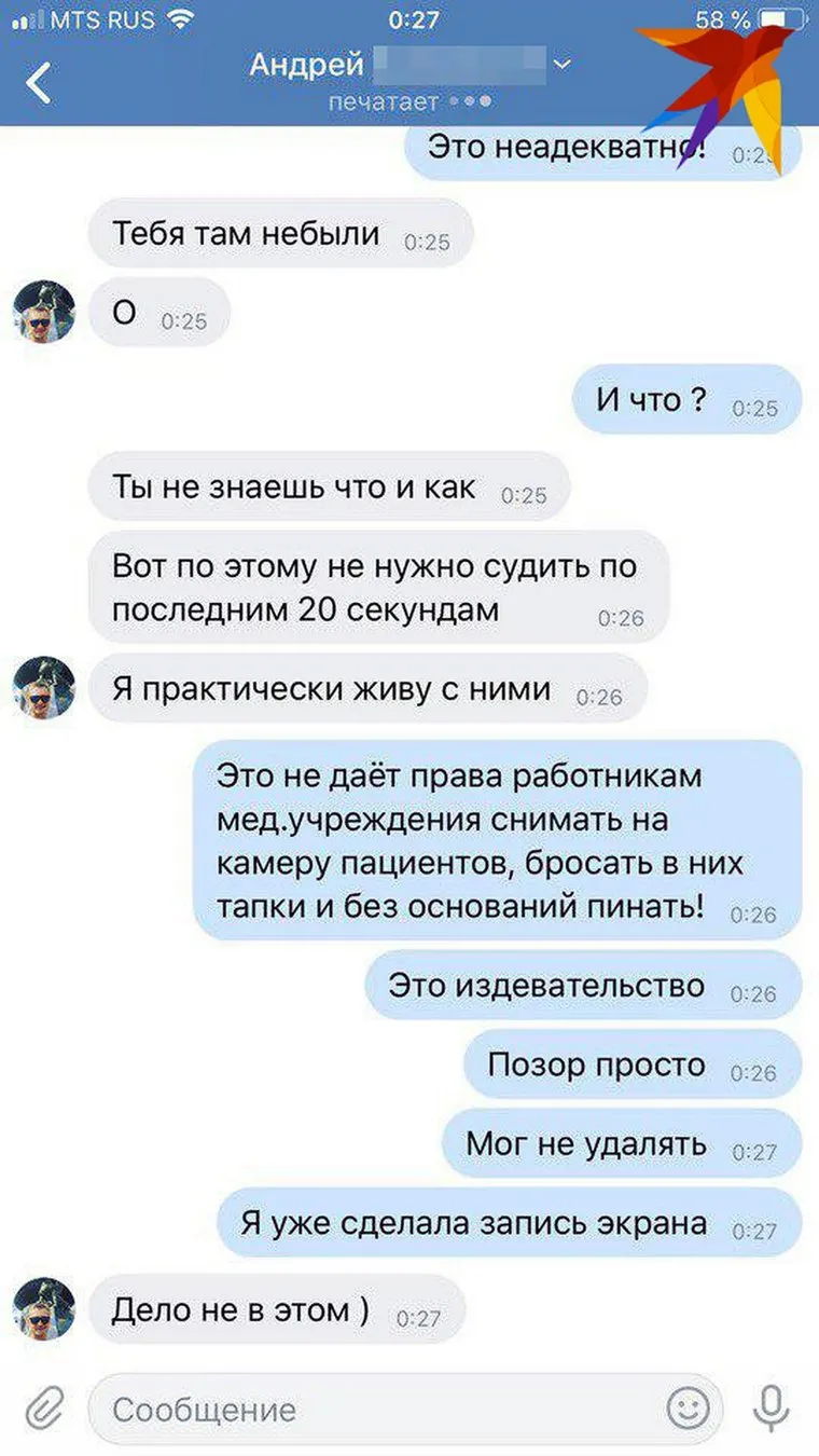 Она рассказала, что познакомилась с молодым человеком по имени Андрей в онлайн-игре, пишет «Комсомольская правда». Их общение продолжилось в соцсети, и тогда санитар стал отправлять девушке видеоролики. «Стал скидывать видео из больницы. Сначала скидывал просто приколы — как люди танцуют, поют. И потом он мне присылает видео, где они пинают пациента. Я, конечно, в шоке была», — призналась девушка.