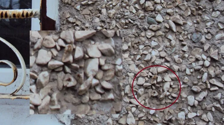 Отметину на стене дома рядом с оконным проемом исследователь идентифицировал как след от пули