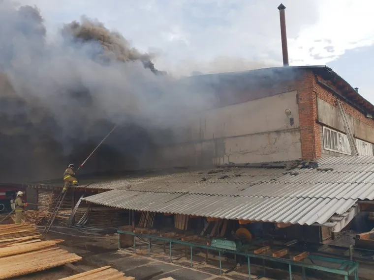Большой пожар бушует в городе Тавда Свердловской области. Загорелся ангар на улице Матросова, в котором хранятся пиломатериалы и готовая продукция — мебель.