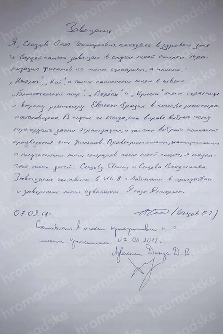 Опубликовано завещание украинского режиссера Олега Сенцова, который отбывает наказание за терроризм. В документе осужденный называет имена тех, кому завещал экранизацию своих работ.