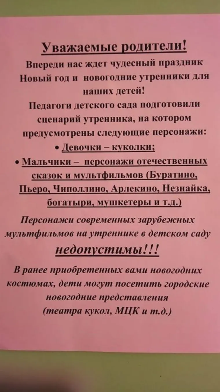 В детском саду Магадана воспитанникам запретили приходить в костюмах героев зарубежных мультфильмов. Снимком объявления в дошкольном образовательном учреждении поделились родители.