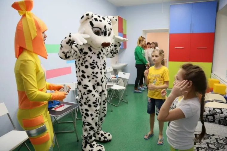 Помещение для пациентов педиатрического отделения раскрашено в яркие цвета. Оно оснащено ТВ-панелью, столами для чтения и рисования, из игрушек в комнате — конструкторы, настольные развивающие игры. Студенты местного колледжа и лицея вызвались организовывать здесь детские праздники, чтобы маленькие пациенты стационара не скучали.