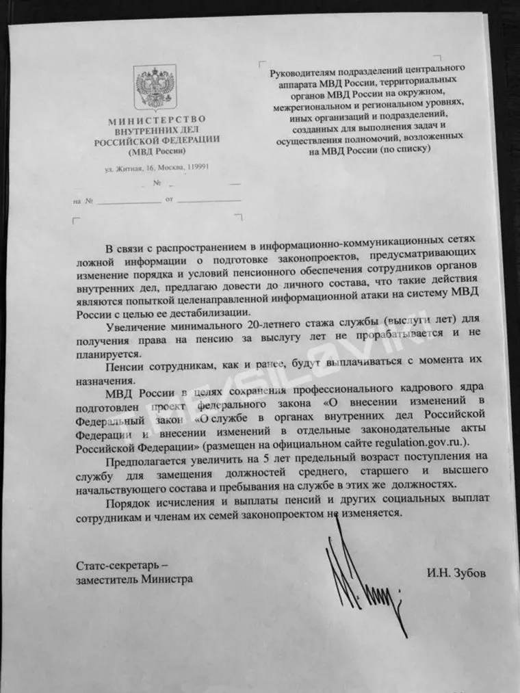 Копия разъясняющего документа опубликована в telegram-канале «Силовики». Появление комментария объясняют тем, что в соцсетях и в органах МВД активно обсуждают слухи о законопроекте, предусматривающем изменение порядка и условий пенсионного обеспечения для сотрудников ведомства .
