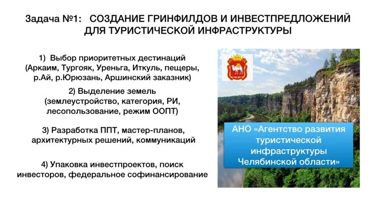 Председатель комитета Южно-Уральской торгово-промышленной палаты по экологии и ресурсосбережению Андрей Минченко продолжит добиваться передачи туризма из минкульта в минэкономразвития Челябинской области. На своей странице в Facebook (деятельность запрещена в РФ) он выставил слайды проекта создания новой структуры, передает корреспондент «URA.RU».
