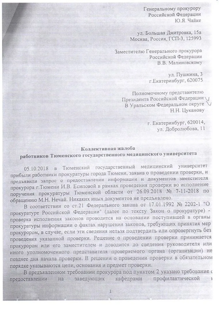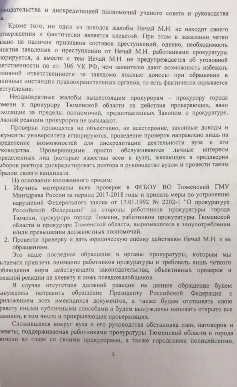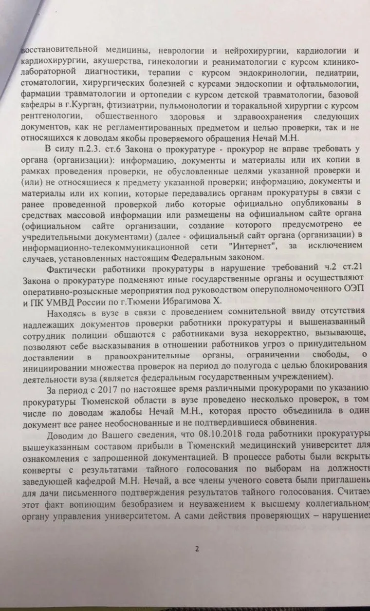 В письме утверждается, что во время прокурорской проверки в октябре 2018 года по заявлению опального сотрудника вуза Марины Нечай был грубо нарушен закон, работники ведомства вели себя некорректно по отношению к преподавателям и «обслуживали интересы лиц, желающих дискредитировать ректора». Они требуют проверить действия сотрудников прокуратуры и обращение Нечай. Ранее Нечай в письме министру здравоохранения России заявила, что в вузе создана система подтасовки результатов голосования на ученом совете, которая позволяет ректору Ирине Медведевой принимать не поддерживаемые коллективом решения. Она также обвинила руководителя в незаконном обогащении, конфликте интересов, и подготовке собственных перевыборов (срок полномочий Медведевой истекает в январе 2019 года).