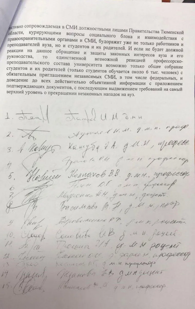 Сейчас в случае отсутствия реакции Генпрокуратуры и полпреда, преподаватели ТюмГМУ грозят провести общее собрание студентов (около 6 тыс. человек) и их родителей, на которое планируют позвать независимые СМИ, чтобы развеять атмосферу «лжи и наговоров» вокруг вуза. Среди подписавшихся значатся доктора медицинских наук Иван Петров, Виктор Колпаков, Эдуард Кашуба и другие.