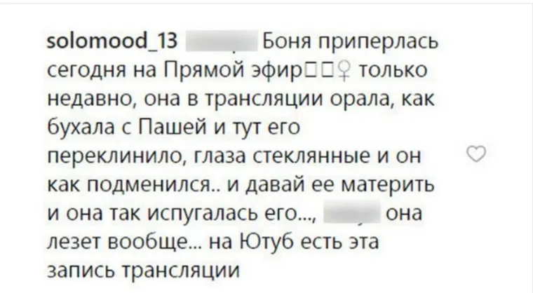 Подписчики Мамаевой обсудили участие Виктории Бони в ток-шоу, которое было посвящено спортсменам Александру Кокорину и Павлу Мамаеву. Одна из подписчиц с ником solomood_13 задала вопрос, что там делала модель и телеведущая. На что Алана Мамаева коротко ответила: «Она с ним спала».
