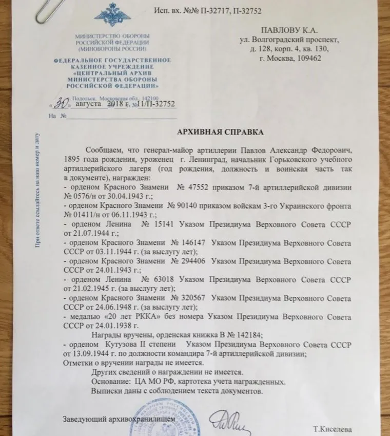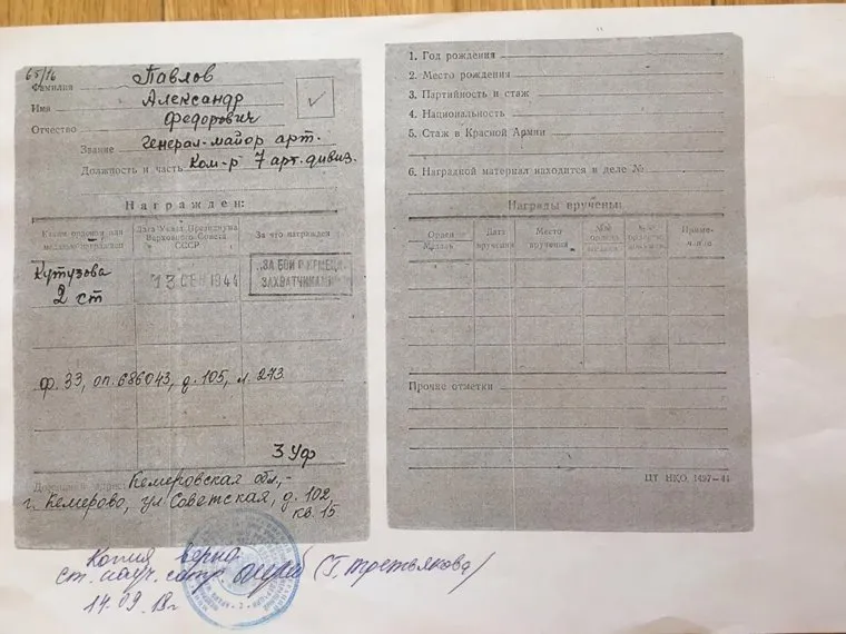 Неуймин сообщил об этом внуку генерала, тот обратился в архив министерства обороны, где нашли наградной лист, в котором есть отметка: «орден не вручен». «К этой награде в 1944 году его представлял командующий 43-й армией, во временном подчинении которого находилась дивизия Павлова. Вскоре его отправили в Карелию, и из-за „военной бюрократии“ вручение не состоялось», — объясняет историк.