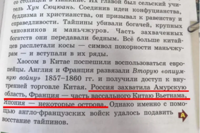 Речь идет об учебнике «История. Новое время. Конец XVIII—XIX век» под авторством Медякова и Бовыкина. В одном из параграфов говорится о том, что Китай в 19 веке лишился ряда территорий, в частности, «Россия захватила Амурскую область».