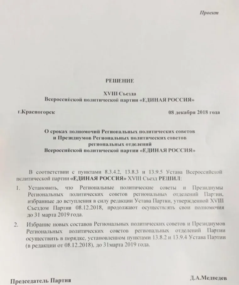Срок полномочий региональных политсоветов партии и их президиумов ограничивается 31 марта 2019 года (проект решения имеется у редакции «URA.RU»). До этой даты нужно избрать новых людей.