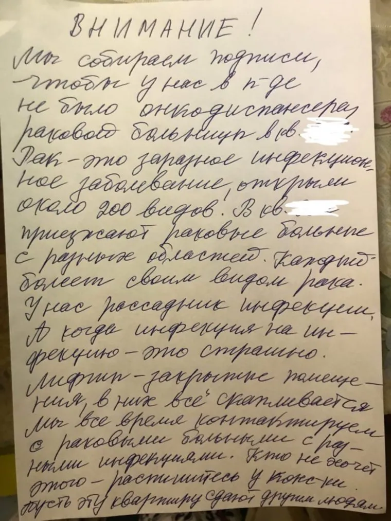 «Мы собираем подписи, чтобы у нас в подъезде не было онкодиспансера раковой больницы в квартире [ номер скрыт ]. Рак — это заразное инфекционное заболевание, открыли около 200 видов. В квартиру приезжают раковые больные с разных областей. Каждый болеет своим видом рака. У нас рассадник инфекции», — говорится в обращении к жильцам. Наиболее «страшным» местом автор письма называет лифт — закрытое помещение, где скапливаются инфекции.