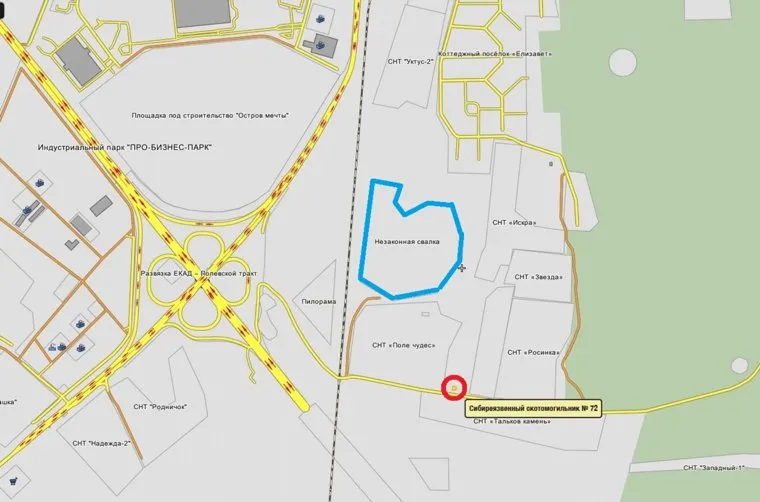 Скотомогильник находится в непосредственной близости от СНТ «Поле чудес» и в 400 метрах от свалки