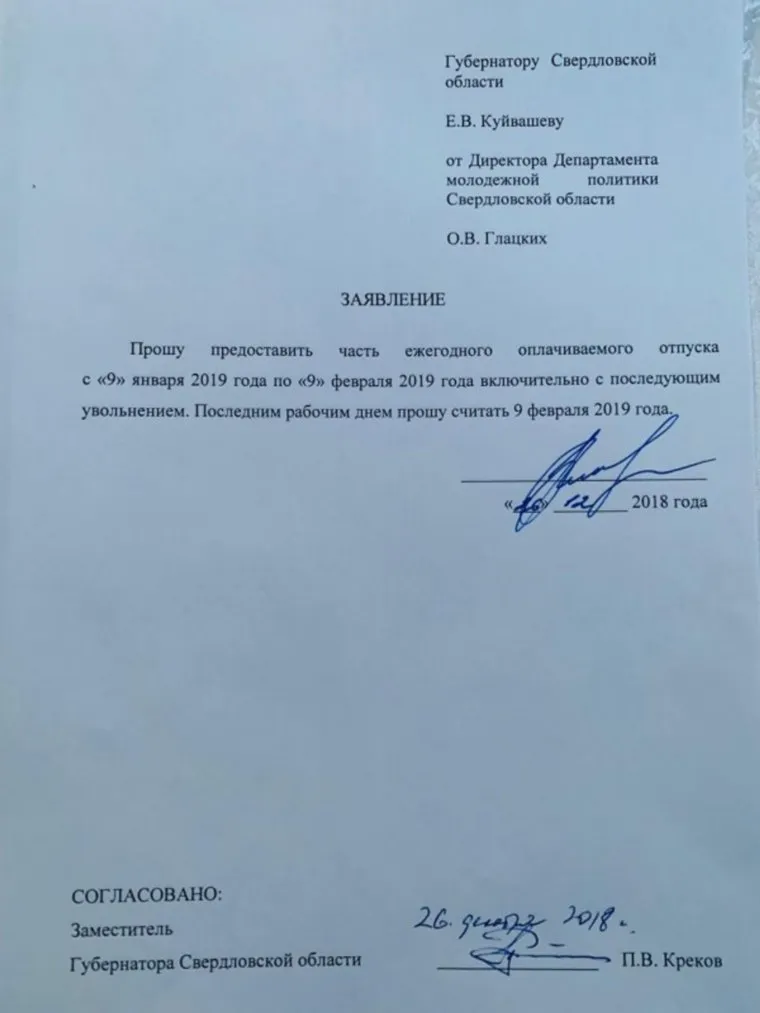 Глава свердловского департамента молодежной политики Ольга Глацких написала заявление об увольнении по собственному желанию. Об этом заявил блогер Сергей Колясников, который ранее брал у нее интервью. Он опубликовал на своей странице в соцсети LiveJournal заявление от чиновницы.