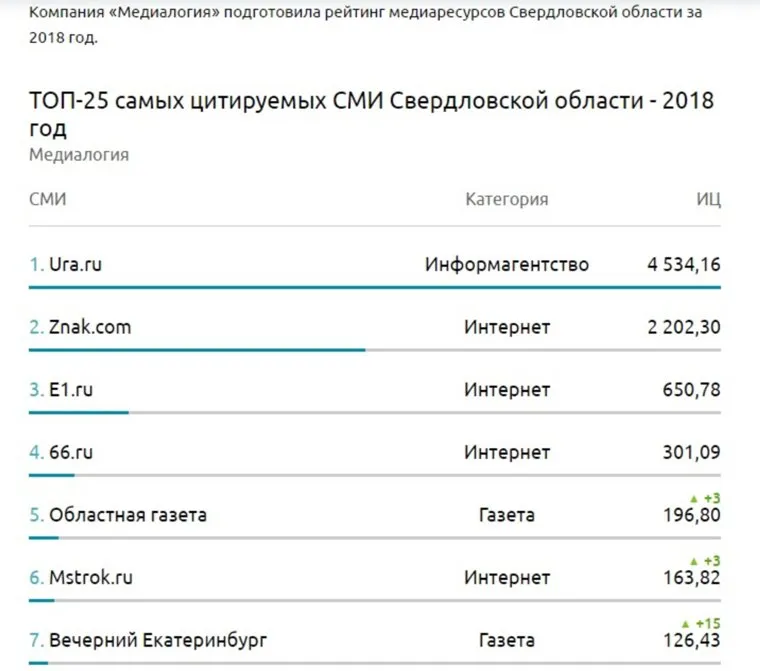 Основой для построения рейтинга стал индекс цитируемости (ИЦ) «Медиалогии», который учитывает количество ссылок на источник информации в других СМИ и количество лайков и репостов материалов в соцсетях. Для информагентства «URA.RU» он составил более 4,5 тысячи, на втором и третьем месте оказались соответственно порталы «Знак.ком» и E1. Отмечается, что специализированные медиа при подсчете не учитывались. Рейтинг составлялся на основе базы СМИ системы «Медиалогия», которая включает в себя порядка 48 тысяч наиболее влиятельных источников. Исследование проводилось в период с января по декабрь 2018 года.