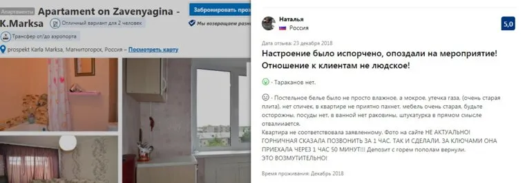 «Апартаменты „На Завенягина — К. Маркса“ расположены в Магнитогорске, в 46 км от горнолыжного подъемника „Металлург-Магнитогорск“. К услугам гостей бесплатный Wi-Fi и гостиная с телевизором. В распоряжении гостей балкон», — говорится в описании к квартире, которая предлагается к сдаче на Карла Маркса, 164 в Магнитогорске. Свои отзывы об апартаментах оставили восемь человек. Квартиросъемщик по имени Наталья квартиру раскритиковала, упомянув и об утечке газа: «Постельное белье было не просто влажное, а мокрое, утечка газа, (очень старая плита), нет спичек, в квартире неприятно пахнет, мебель очень старая, будьте осторожны». Отзыв был оставлен 23 декабря 2018 года — за восемь дней до взрыва в одной из квартир дома.