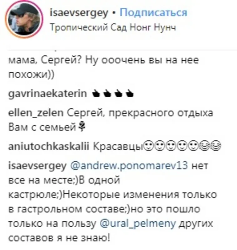 «Что с пельменями? Пишут, что Вы все разбежались по разным углам!», — обратился к Исаеву его подписчик в Instagram (деятельность запрещена в РФ) andrew.ponomarev13. Артист поспешил развеять слухи о расколе в «Уральских пельменях». «Нет, все на месте. В одной кастрюле. Некоторые изменения только в гастрольном составе, но это пошло только на пользу», — заверил Исаев.