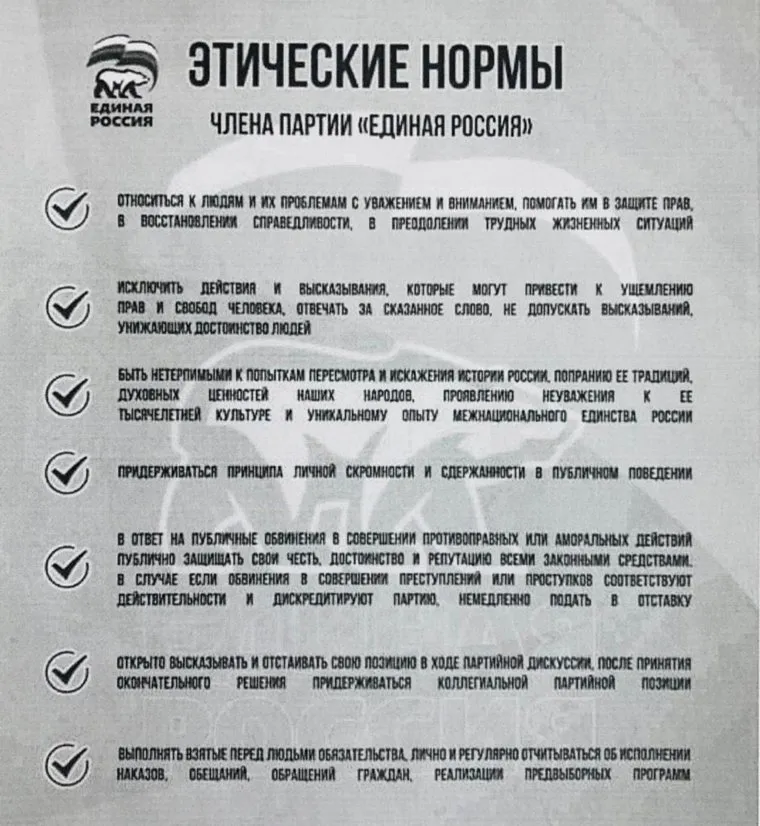 После заседания президиума Генерального совета «ЕР» 17 января стало известно о введении «Этических норм члена партии «Единая Россия». В памятке партийцам рекомендуют внимательно относиться к людям и их проблемам, помогать им в защите их прав и свобод, отвечать за сказанные слова и не унижать их достоинство. Кроме того, члены партии должны быть нетерпимыми к пересмотру и искажению истории страны. Один из пунктов памятки гласит: «Придерживаться принципа личной скромности и сдержанности в публичном поведении».
