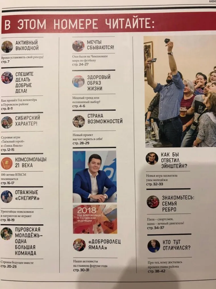 В Пуровском районе устроят проверку из-за фотографии в молодежном журнале «Север молодой». Читателей журнала возмутило, что рядом с фотографией губернатора Дмитрия Артюхова и заголовками о здоровом образе жизни было опубликовано фото молодых людей, проводящих время с алкоголем. Фото в редакцию «URA.RU» прислал местный общественник Алексей Шевцов.