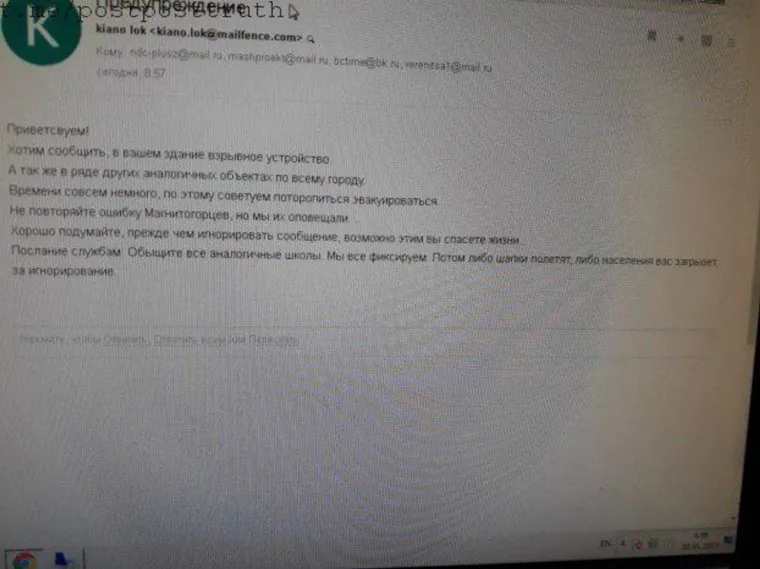 Скрин письма, написанного с ошибками, опубликовал один из получателей. «В вашем здании бомба. Времени совсем немного, поэтому советуем эвакуироваться. Не повторяйте ошибку магнитогорцев», — говорится в послании. Сейчас в городах, где сообщили о терактах, проводится эвакуация. В Хакасии письма о готовящихся взрывах уже назвали ложными, сообщает РИА «Новости».