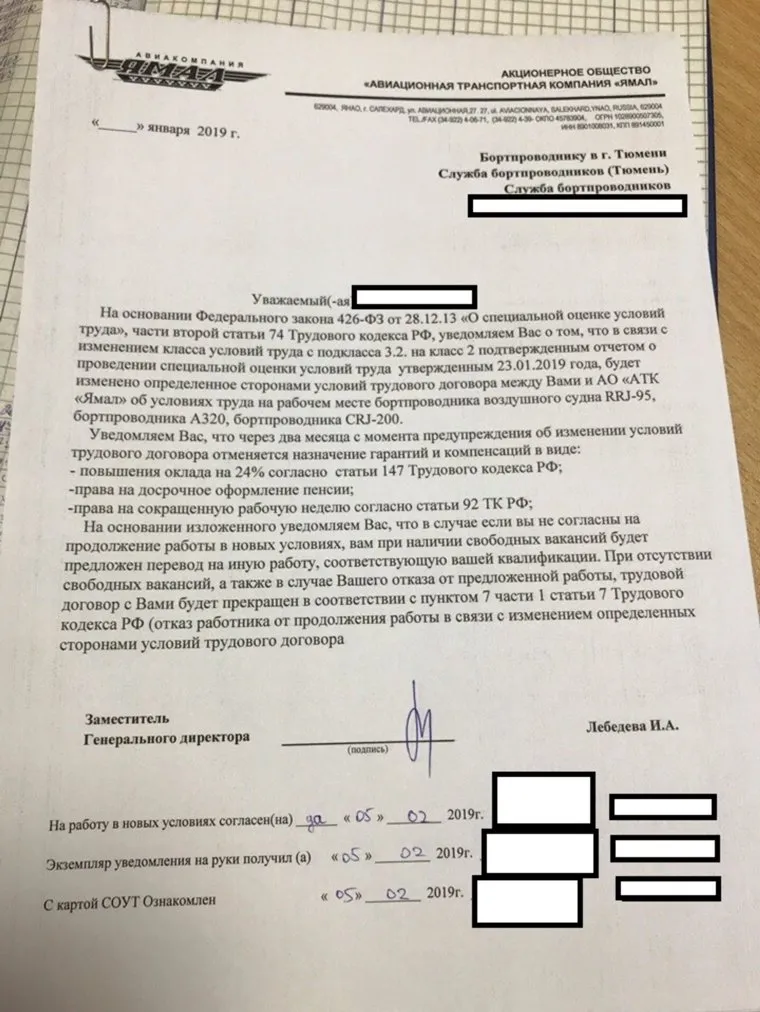 Бортпроводников, работающих на рейсах авиакомпании «Ямал», лишили четверти зарплаты и возможности досрочного выхода на пенсию. В компании прошла проверка, после которой условия труда бортпроводников признали не вредными для здоровья и забрали соответствующую надбавку. Несогласных на новые условия ждет сокращение. Об этом «URA.RU» рассказали сотрудники ямальской авиакомпании. Свои слова они подтвердили официальными письмами и коллективной жалобой.