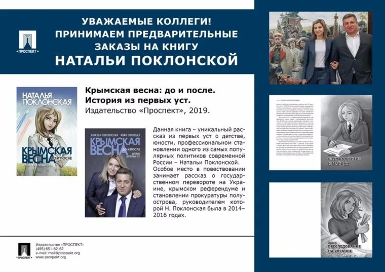 Депутат Государственной Думы РФ, экс-прокурор Крыма Наталья Поклонская, вместе с мужем Иваном Соловьёвым написала книгу о событиях «Крымской весны». Новостью Поклонская поделилась на своей странице во «ВКонтакте».