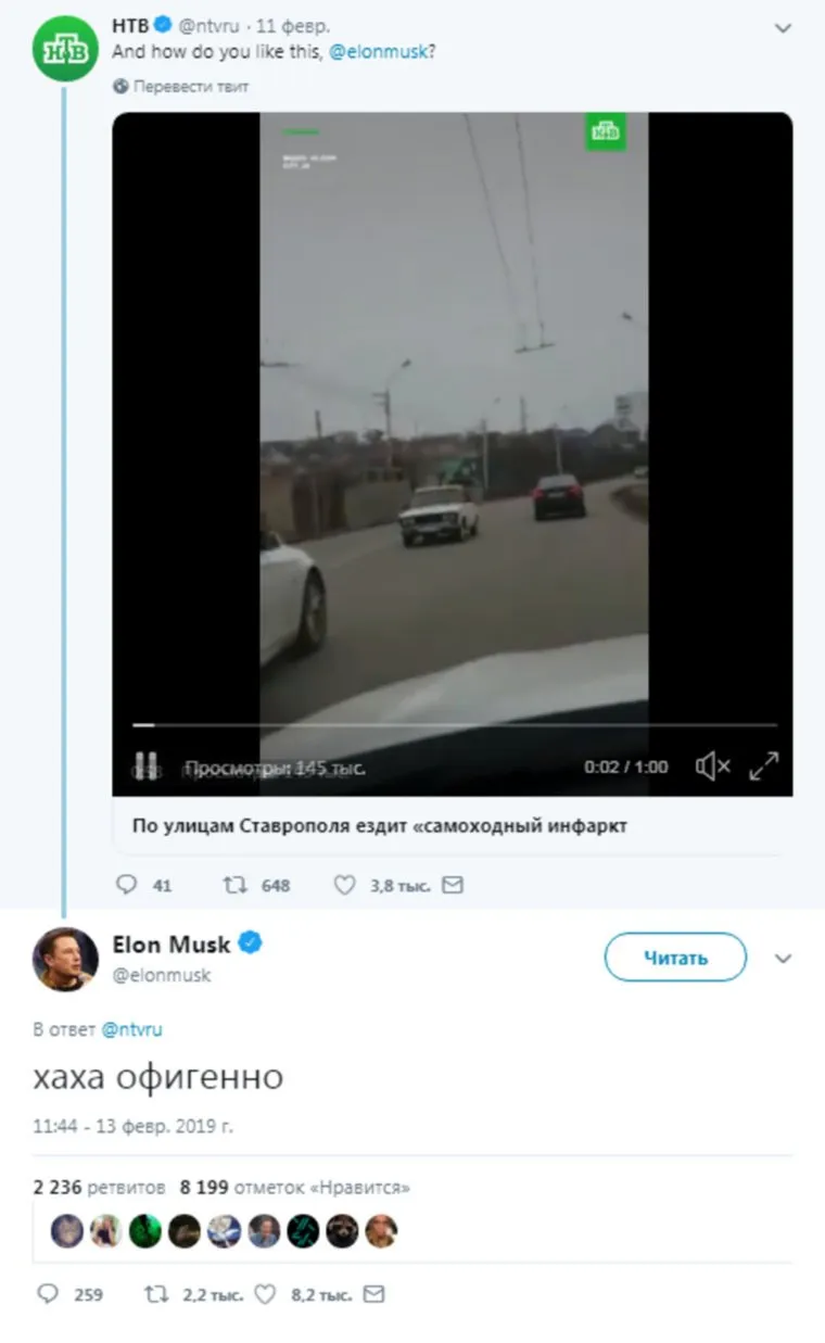 Ранее «URA.RU» сообщало, что житель Ставрополя собрал ВАЗ-2106 задом наперед — руль установил на месте задних кресел, а двигатель расположил в багажнике. Телеканал «НТВ» снял об умельце сюжет и разместил пост в Twitter, сопроводив публикацию мемом «How do you like this, @elonmusk» («Как тебе такое, Илон Маск»). Неожиданно для всех мультимиллионер ответил . Позже ГИБДД Ставропольского края привлекла мастера к ответственности .