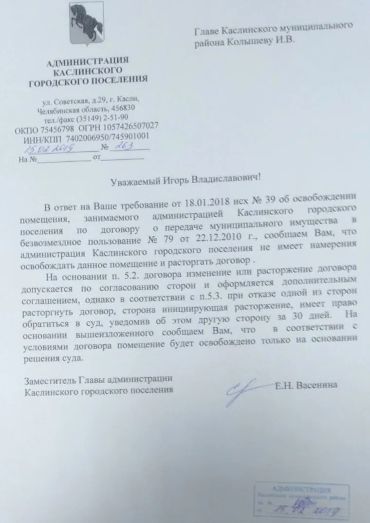 «В ответ на ваше требование об освобождении помещений, сообщаем, что администрация Каслей не имеет намерения освобождать помещение и расторгать договор [аренды]. Изменение или расторжение договора опускается по согласованию сторон. При отказе одной из сторон, вторая сторона имеет право обратиться в суд. В соответствии с условиями договора, помещение будет освобождено только на основании решения суда», — говорится в ответе мэрии.