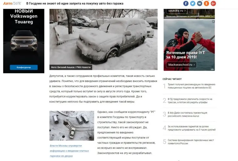 «URA.RU» стало первым СМИ, сообщившим о таких предложениях. В субботу, 16 февраля, агентство со ссылкой на источники в ГД рассказало о том, что в российском парламенте кулуарно обсуждают идею запрета продажи автомобилей водителям без парковочного места — инициатива исходит из регионов. О готовящемся законопроекте речи не шло. Материал вызвал огромный резонанс (охват — 79 миллионов читателей, «URA.RU» цитировали Lenta.ru, Gazeta.ru, НТВ и другие СМИ). В ГД раскритиковали публикацию. На официальном сайте парламента появилось опровержение от главы комитета по транспорту Евгения Москвичева: «Нет у нас законопроекта такого, и мы считаем, что запрета никакого не должно быть. Это просто „фейк“». Депутат Сергей Вострецов выступил через СМИ с заявлением, что «наказание за распространение [недостоверной информации] нужно ужесточать вплоть до уголовной ответственности». В качестве примера он привел публикацию «URA.RU» об идее ограничения продажи автомобилей.