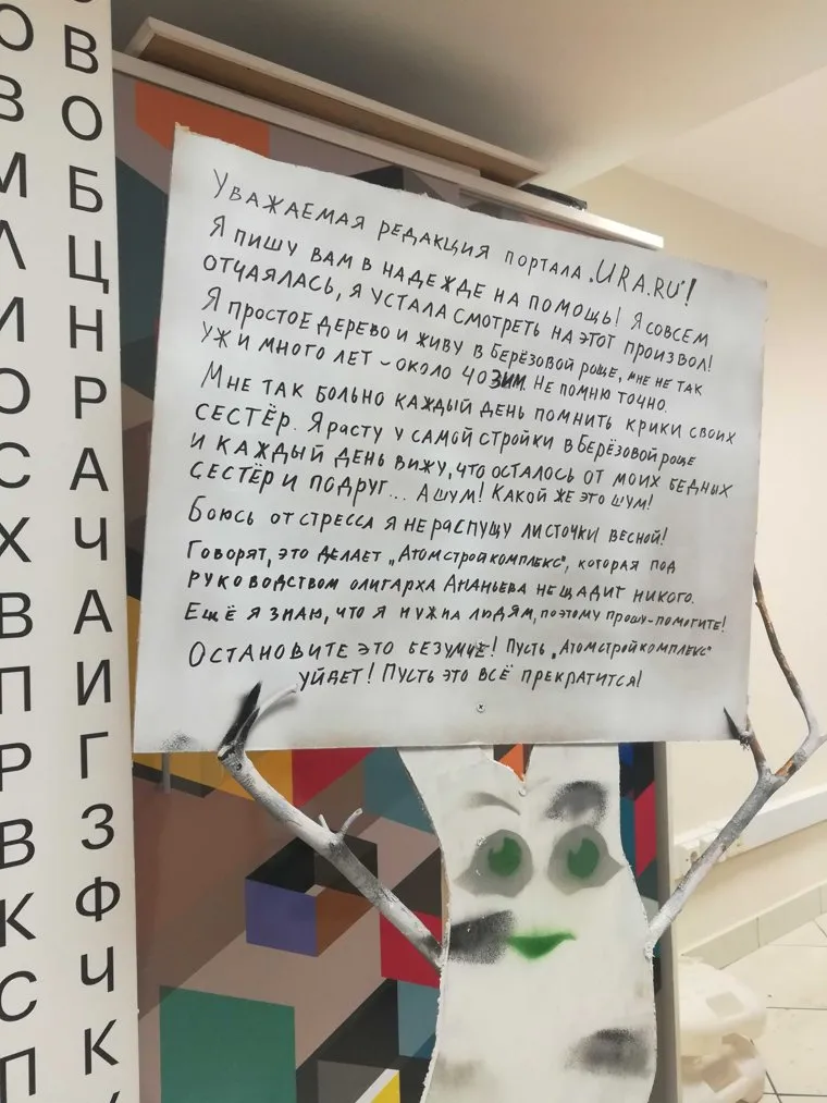 Рядом со входом в редакцию «URA.RU» в Екатеринбурге появилось самодельное дерево с посланием от анонимных защитников березовой рощи в Академическом районе. В письме они просят информагентство помочь остановить вырубку деревьев.