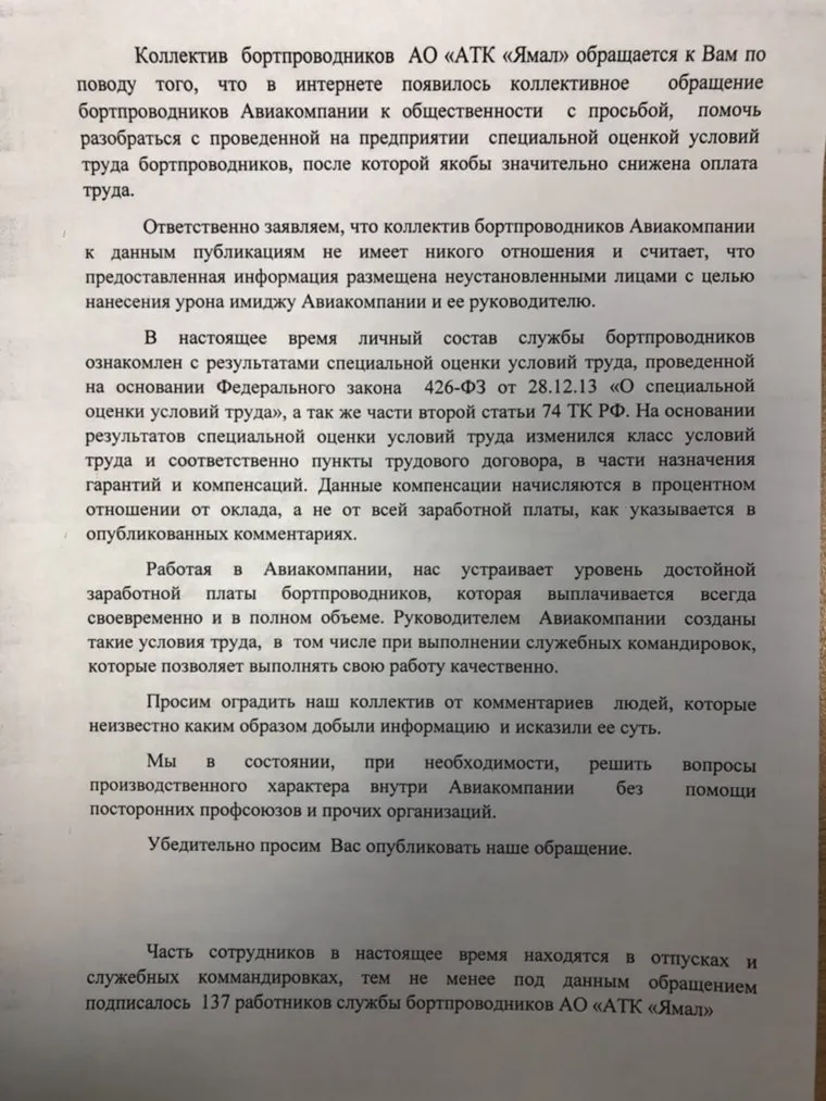 Сотрудники не имеют отношения к последствиям оценки условий труда бортпроводников, после которой снизилась зарплата, говорится в письме. «Предоставленная информация размещена неустановленными лицами с целью нанесения урона имиджу Авиакомпании и ее руководителю. Работая в Авиакомпании, нас устраивает уровень достойной заработной платы бортпроводников, которая выплачивается всегда своевременно и в полном объеме», — следует из послания (орфография и стиль сохранены — прим.ред.). Под текстом подписались 137 работников службы бортпроводников «Ямала», не считая тех, кто находится в отпусках и служебных командировках.