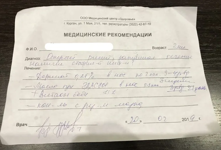 По ее словам, после капель в нос двухмесячный ребенок начал задыхаться, изо рта у него пошла пена, начались спазмы. В результате малыш попал в стационар. Женщина уверена, что виной всему неправильно выписанный специалистом медицинского центра «Здоровье» рецепт, который она, в доказательство своих слов, разместила в сообществе «Черный список. Курган» во «ВКонтакте».