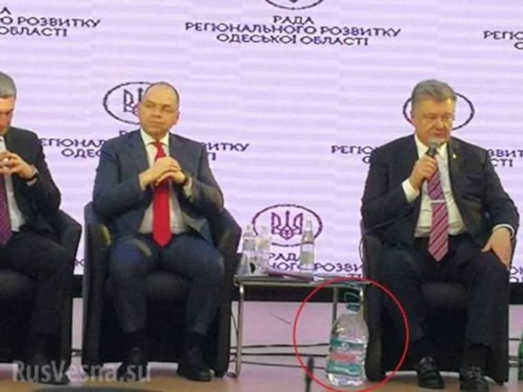 Пользователи социальных сетей активно распространяют снимок президента Украины Петра Порошенко на мероприятии в Одессе. У ног главы государства стояла пятилитровая пластиковая бутыль с водой, пока он принимал участие в заседании Совета регионального развития Одесской области.