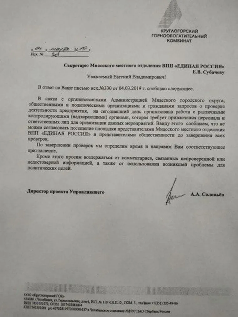 «Организована работа с контролирующими (надзирающими) органами, которая требует привлечение персонала и ответственных лиц для организации этих мероприятий. Сообщаем, что не можем согласовать посещение площадки представителями миасского отделения ВПП „Единая Россия“ и представителями общественности до завершения всех проверок», — говорится в письме, присланном на имя секретаря отделения Евгения Субачева.