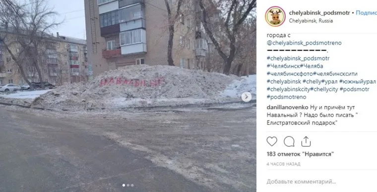 Жители Челябинска пошли на крайние меры, чтобы привлечь внимание властей к уборке улиц от снега. Они написали красными буквами на большом сугробе фамилию оппозиционного блогера Алексея Навального, передает корреспондент «URA.RU».